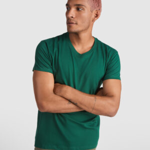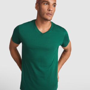 Fitted t-shirt with crew neck and v-opening on front. Trimmed half-sleeve and side seams.