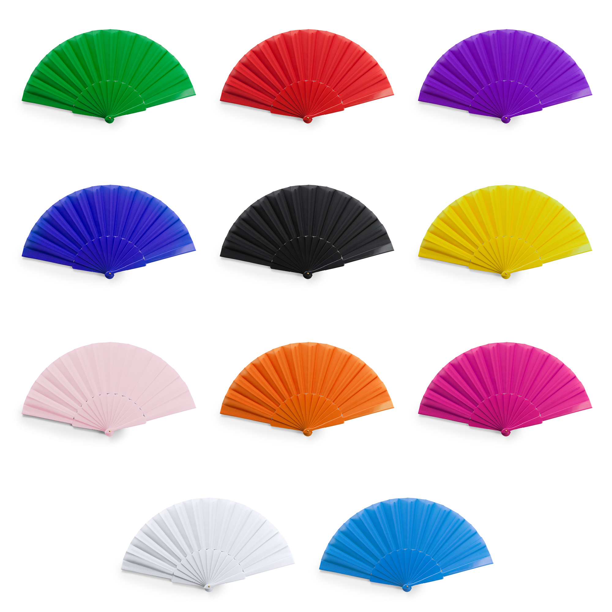 Hand fan with plastic ribs and polyester fabric.