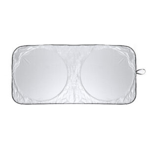 Rectangular car sun shield with aluminium front and white foam back. Two metal eyelets in both upper corners for suction cups. Black edging and elastic straps for folding.